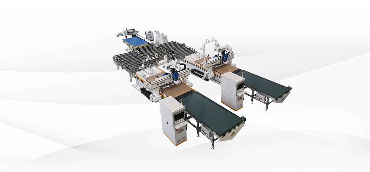 一拖二開料單元是一套自動(dòng)化程度比較高的數(shù)控開料解決方案。開料單元由一臺(tái)高速自動(dòng)貼標(biāo)機(jī)、兩臺(tái)全自動(dòng)數(shù)控開料中心以及動(dòng)力滾筒線、中控系統(tǒng)組成。人工只需將板材放置在升降機(jī)上,由貼標(biāo)機(jī)自動(dòng)貼標(biāo),再由中控系統(tǒng)自動(dòng)分配至開料中心,完成板材切割工作。如選配機(jī)器人系統(tǒng),可由機(jī)器人完成碼垛,余料利用及廢料輸出等工作。
